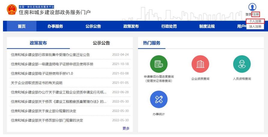 用戶進入“住房和城鄉建設部政務服務門戶”頁面(圖1),點擊【注冊】(圖1)進入個人用戶注冊界面(圖2),按照提示完成賬號注冊。