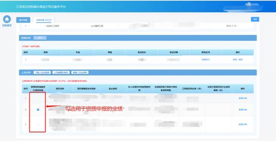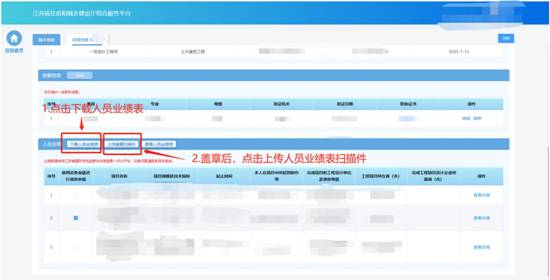 對于“技術負責人”或者“非注冊人員”或者“注冊人員”角色的人員,詳細信息會展示人員業績,人員業績信息來自江蘇省建筑市場監督與誠信信息一體化平臺,不可在本頁面進行維護和修改。勾選需要使用的業績,點擊“下載人員業績表”,系統根據人員情況自動生成人員業績表
