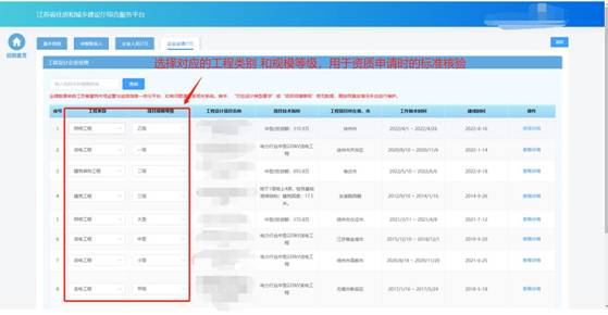 若申請的資質對于企業業績有要求,則申報流程會包含“工程業績”環節。在“工程業績”環節頁面,企業按照所申請資質類別分別選擇對應的業績。點擊“選擇工程業績”按鈕,選擇用于本次申報的業績。