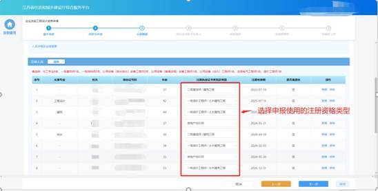 在“人員情況”環節頁面,企業按照所申請資質類別分別選擇對應的各類人員。選擇的人員信息為企業在“企業信息維護”頁面已經維護的對應角色的人員,如有信息不正確或者信息缺失,需返回“企業信息維護”頁面進行修改或補充后,再繼續進行申請。