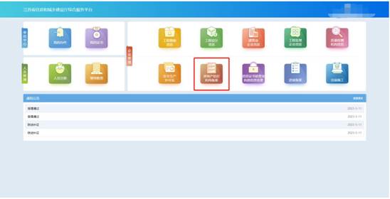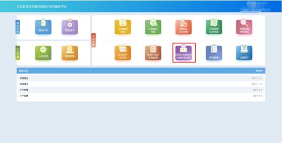 點擊首頁“企業管理”模塊中“資質證書依營業執照信息變更”圖標可發起因企業營業執照信息變更而變更資質證書信息的事項或者變更部批證書法人信息、單位負責人信息的事項。
