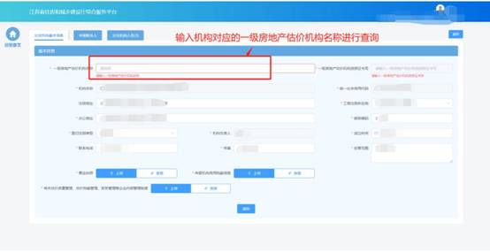 在分支機構基本信息頁面中填寫機構基本信息。在一級房地產估價機構名稱一欄中輸入機構對應的一級房地產估價機構名稱,系統根據輸入的名稱精確查詢對應的房地產估價機構信息和一級資質證書信息。