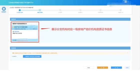 “一級房地產估價分支機構信息維護”頁面維護的信息,如有信息不正確或者信息缺失,需返回“一級房地產估價分支機構信息維護”頁面進行修改或補充后,再繼續進行申請。