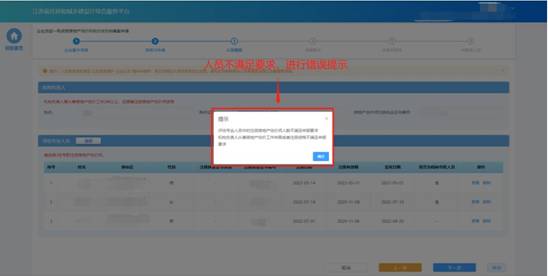 人員選擇完成后,點擊“下一步”按鈕,系統會按照申報要求對選擇人員進行初步校驗,對于不滿足要求的人員進行錯誤提示。若選擇人員滿足要求則進入下一個環節。