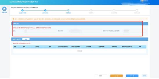 在“人員情況”環節頁面,企業選擇用于本次事項申報的人員。選擇的人員信息為企業在“一級房地產估價機構分支機構信息維護”頁面已經維護的對應角色的人員,如有信息不正確或者信息缺失,需返回“一級房地產估價機構分支機構信息維護”頁面進行修改或補充后,再繼續進行申請。