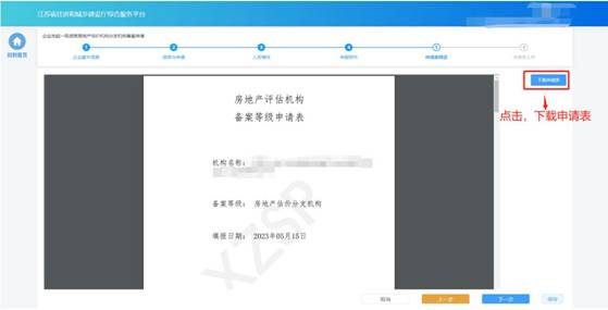 在“申請表預覽”頁面展示系統根據企業填報的內容自動生成的申請表,點擊“下載申請表”按鈕下載申請表Pdf文件,企業將申請表打印后進行蓋章,然后點擊“下一步”按鈕上傳蓋章掃描件。