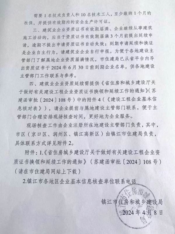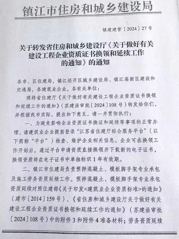 現將省住建廳《關于做好有關建設工程企業資質證書換領和延續工作的通知》(蘇建函審批[2024】108號)轉發給你們,并根據我市實際,提出如下意見,請一并貫徹執行:
