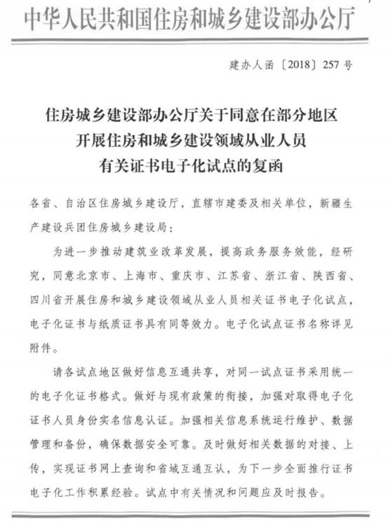 南通潤遠(yuǎn)從省住建廳的公告得知,今后為提高服務(wù)和監(jiān)管效能,實(shí)現(xiàn)證照數(shù)字化管理目標(biāo),根據(jù)《省政府關(guān)于加快江蘇政務(wù)服務(wù)網(wǎng)建設(shè)的實(shí)施意見》(蘇政發(fā)〔2017〕53號)《住房和城鄉(xiāng)建設(shè)部辦公廳關(guān)于同意在部分地區(qū)開展住房和城鄉(xiāng)建設(shè)領(lǐng)域從業(yè)人員有關(guān)證書電子化試點(diǎn)的復(fù)函》(建辦人函〔2018〕257號)(附件1)的文件精神,我省將啟用二級建造師(含臨時)、二級結(jié)構(gòu)工程師、二級建筑師電子注冊證書(以下簡稱“電子證書”),這樣將會取消變更帖的寄放,F(xiàn)將有關(guān)事項公告如下: