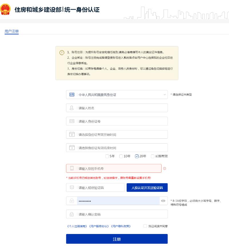 住房和城鄉建設部政務服務門戶網站現在個人賬號分三類:法定代表人賬號,管理員賬號,經辦人賬號。法定代表人是權限最高的賬號,可以有全部的權限,可以進入一建平臺做審核操作和修改企業相關信息;管理員賬號和法定代表人賬號權限類似,需要法定代表人授權,授權期限最長三年,但是不可以進入一建平臺做審核操作;經辦人賬號可以由法定代表人和管理員授權,授權期限最長一年,可以進入一建平臺做審核操作。一個個人賬號只可以授權成為管理員賬號或者授權成為經辦人賬號,不可以同時授權為管理員賬號和經辦人賬號。所以我們日常操作一建人員注冊注銷確認只要法定代表人用法定代表人賬號授權員工的經辦人賬號即可,管理員賬號可以不注冊。