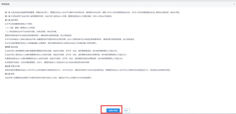 點擊“企業名稱”以后,再次點擊“確認”,閱讀“平臺規則”,點擊“知曉并同意”以后,就可以完成經辦人的授權。