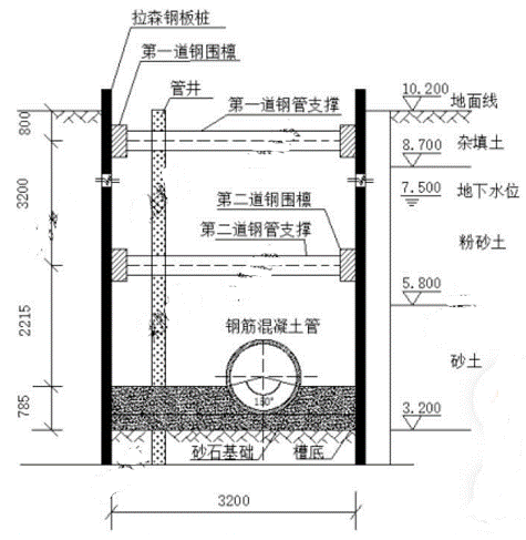 某公司承建一項(xiàng)城市污水管道工程,管道全長(zhǎng)1.5km。采用DN1200mm的鋼筋混凝土管,管道平均覆土深度約6m。考慮現(xiàn)場(chǎng)地質(zhì)水文條件,項(xiàng)目部準(zhǔn)備采用“拉森鋼板樁+鋼圍檁+鋼支撐”的支護(hù)方式,溝槽支護(hù)情況詳見(jiàn)圖2。