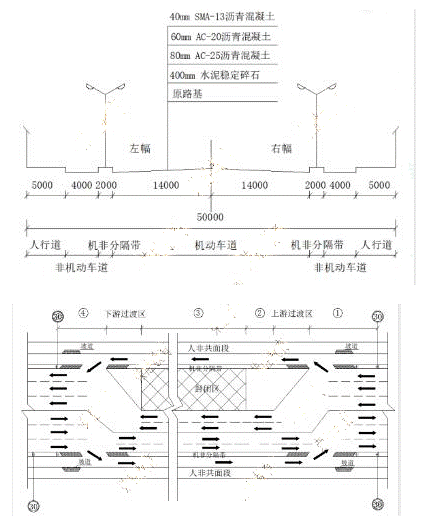 某單位承建城鎮(zhèn)主干道大修工程,道路全長(zhǎng)2km,紅線寬50m,路幅分配情況如圖1-1所示,現(xiàn)狀路面結(jié)構(gòu)為40mmAC-13細(xì)粒式瀝青混凝土上面層,60mmAC-20中粒式瀝青混凝土中面層,80mmAC-25粗粒式瀝青混凝土下面層。工程主要內(nèi)容為:①對(duì)道路破損部位進(jìn)行翻挖補(bǔ)強(qiáng)。②銑刨40mm|舊瀝青混凝土上面層后,加鋪40mmSMA-13瀝青混凝土上面層。接到任務(wù)后,項(xiàng)目部對(duì)現(xiàn)狀道路進(jìn)行綜合調(diào)查,編制了施工組織設(shè)計(jì)和交通導(dǎo)行方案。并報(bào)監(jiān)理單位及交通管理部門(mén)審批,導(dǎo)行方案如圖1-2所示,因辦理占道、挖掘等相關(guān)手續(xù),實(shí)際開(kāi)工如期比計(jì)劃日期滯后2個(gè)月。