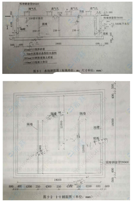 A公司承建某地下水池工程,為現(xiàn)澆鋼筋混凝土結(jié)構(gòu)。混凝土設(shè)計(jì)強(qiáng)度為C35,抗?jié)B等級(jí)為P8.水池結(jié)構(gòu)內(nèi)設(shè)有三道鋼筋混凝土隔墻,頂板,上設(shè)置有通氣孔及人孔,水池結(jié)構(gòu)如圖5-1、5-2所示。A公司項(xiàng)目部將場(chǎng)區(qū)內(nèi)降水工程分包給B公司。結(jié)構(gòu)施工正值雨期,為滿足施工開(kāi)挖及結(jié)構(gòu)抗浮要求,B公司編制了降排水方案,經(jīng)項(xiàng)目部技術(shù)負(fù)責(zé)人審批后報(bào)送監(jiān)理單位。水池頂板混凝土采用支架整體現(xiàn)澆,項(xiàng)目部編制了頂板支架支拆施工方案,明確了拆除支架時(shí)混凝土強(qiáng)度、拆除安全措施,如設(shè)置上下爬梯、洞口防護(hù)等。項(xiàng)目部計(jì)劃在頂板模板拆除后,進(jìn)行底板防水施工,然后再進(jìn)行滿水試驗(yàn),被監(jiān)理工程師制止。項(xiàng)目部編制了水池滿水試驗(yàn)方案,方案中對(duì)試驗(yàn)流程、試驗(yàn)前準(zhǔn)備工作、注水過(guò)程、水位觀測(cè)、質(zhì)量、安全等內(nèi)容進(jìn)行了詳細(xì)的描述,經(jīng)審批后進(jìn)行了滿水試驗(yàn)。