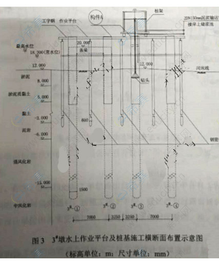 某公司承建一座跨河城市橋梁, 基礎(chǔ)均采用φ1500mm鋼筋混凝土鉆孔灌注樁,設(shè)計(jì)為端承樁,樁底嵌入中風(fēng)化巖層,2D (D為樁基直徑) ;樁頂采用蓋梁連接,蓋梁高度為1200mm,頂面標(biāo)高為20.000m。 河床地基揭示依次為淤泥、淤泥質(zhì)黏土、黏土、泥巖、強(qiáng)風(fēng)化巖、中風(fēng)化巖項(xiàng)目部編制的樁基施工方案明確如下內(nèi)容: (1)下部結(jié)構(gòu)施工采用水上作業(yè)平臺(tái)施工方案,水上作業(yè)平臺(tái)結(jié)構(gòu)為φ600mm鋼管樁+型鋼+人字鋼板搭設(shè),水上作業(yè)平臺(tái)如圖3所示(2) 根據(jù)樁基設(shè)計(jì)類(lèi)型及橋位、水文、地質(zhì)筆情況設(shè)備選用“2000型”正循環(huán)回旋鉆孔施工(另配壓輪鉆頭等),成樁方式未定(3) 圖中A結(jié)構(gòu)名稱(chēng)和使用的相關(guān)規(guī)定(4)由于設(shè)計(jì)對(duì)孔底沉渣厚度未做具體要求,灌注水下混凝土前,進(jìn)行二次清孔,當(dāng)孔底沉渣厚度滿足規(guī)范要求后,開(kāi)始灌注水下混凝土。