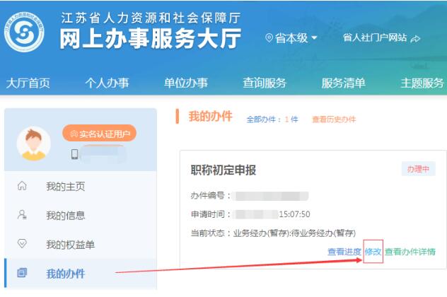 進入個人中心,請點擊“我的辦件” → 職稱初定申報 → 修改,繼續填報。