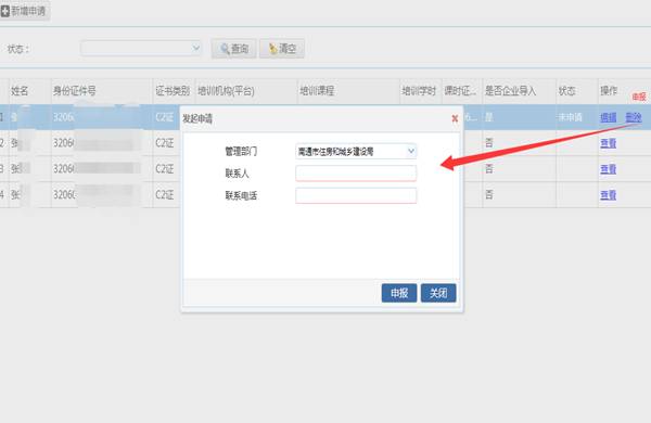 4、點(diǎn)擊“操作”中的“申報(bào)”,在彈出窗口中輸入聯(lián)系人及電話。