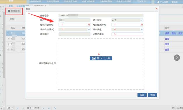 3、點(diǎn)擊左上角“新增申請(qǐng)”,陸續(xù)填入1、2、3、4、5、6位置有關(guān)信息,點(diǎn)擊“保存”