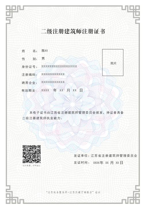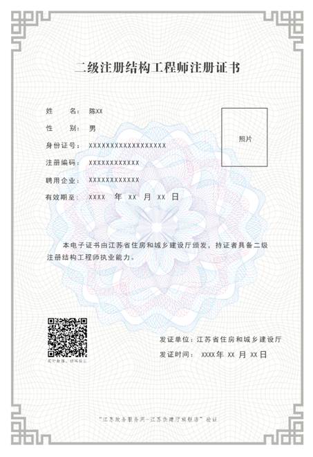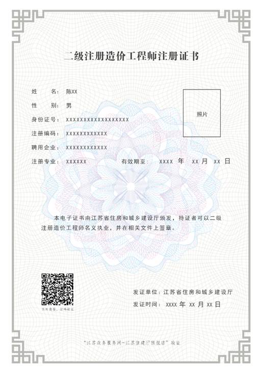 準予注冊的,由江蘇省住建廳核發《二級建造師注冊證書》《二級注冊造價工程師注冊證書》《二級注冊建筑師注冊證書》《二級注冊結構工程師注冊證書》,注冊證書以電子證照形式發放(證書樣式詳見附件2)。