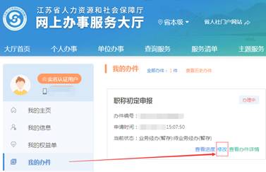 進入個人中心,請點擊“我的辦件” → 職稱初定申報 → 修改,繼續填報。