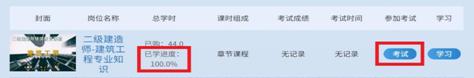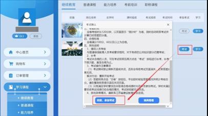 用戶完成在線課程學習,取得本課程全部學時后,課程的“考試”按鈕高亮顯示,允許用戶進行在線測試。
