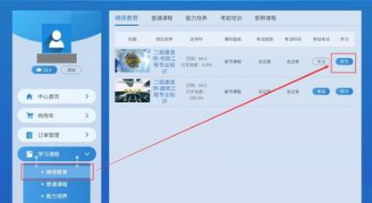 在左側菜單欄選擇“學習課程”,點擊“繼續教育”頁簽查看本賬號的繼續教育課程。用戶可在繼續教育課程列表右側,點擊“學習”按鈕進入視頻播放頁面。