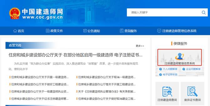 登錄“中國建造師網”(點擊進入),點擊“注冊建造師管理信息系統”。