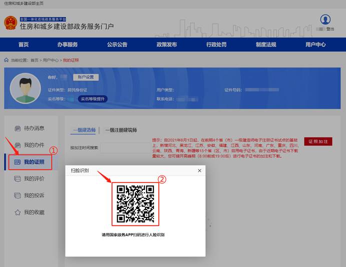 進入“用戶中心”頁面后,點擊【我的證照】(①),然后使用手機打開“國家政務服務平臺”APP,點擊APP界面上方的掃描圖標,掃描頁面的二維碼(②),然后點擊“國家政務服務平臺”APP中的【開始人臉識別】按鈕,按要求進行人臉識別,識別無誤后,進入電子證照管理頁面。